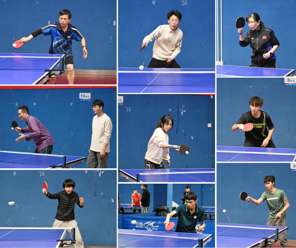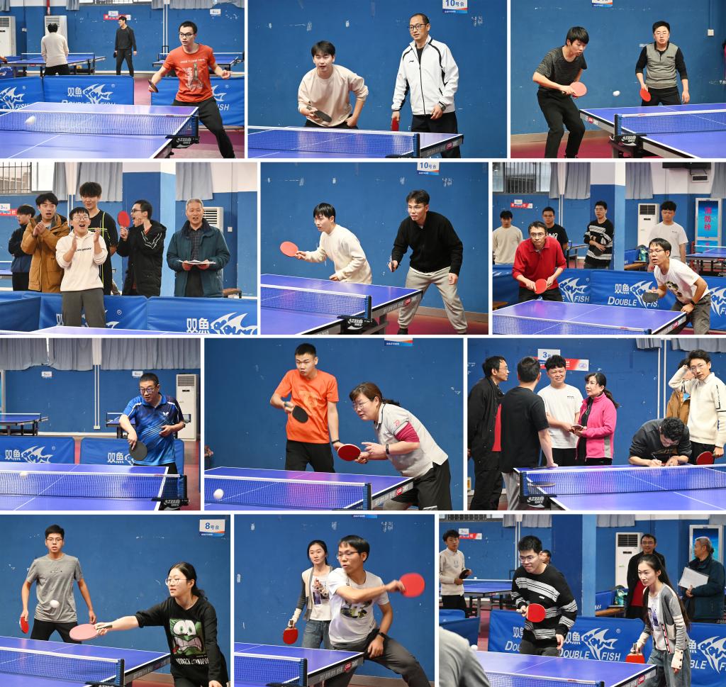 球桌上,队员们聚精会神,反应迅速,步伐稳健,挥拍自如,发球、攻球、推球、挡球,弧圈球、提拉球、搓球、削球,力争拿下每一分;球场下,观众们紧盯着千变万化的比赛局势,为每一位球员精彩的进攻防守激情呐喊,加油助威;休息时,大家都互相传授着比赛时的经验,为队友赢下比赛而出谋划策,同时也不乏着欢声笑语,师生们是队友,亦是对手,现场气氛紧张却又欢快,师生们都沉浸在乒乓球运动带来的乐趣之中。
