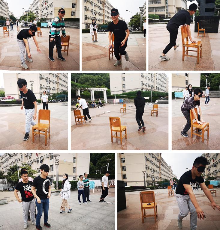 最后进行的是蒙眼障碍走接力赛,一人蒙眼在队友指挥下绕桩取物,并返回起点,考验的是团队默契和相互信任的程度。被蒙眼队员小心谨慎,却又时刻提醒自己要保证速度;指挥队员奋力呼喊、发令,速度固然重要,但一定同伴的安全放在第一位。
