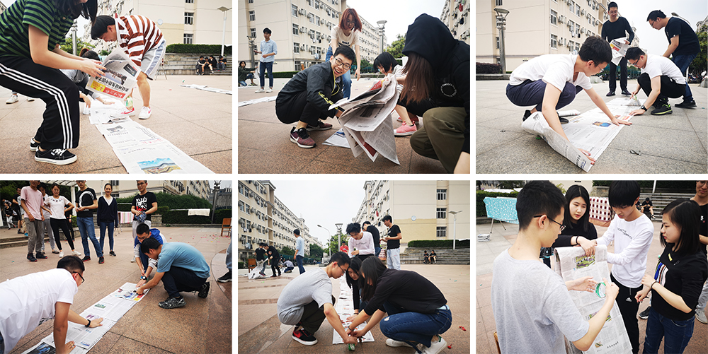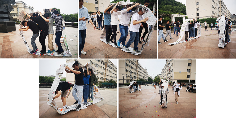 “无敌风火轮”更加考验团队合作意识,需要将报纸连接成履带,全员排队站在履带上,手脚并用地传送,直到所有人到达终点。团队中有的人负责摆放报纸,有的人负责固定胶带,有的人负责粘接,有的负责估算长度,环环相扣,每个人在团队中都起到至关重要的作用。履带短,做得快却走得慢;履带长,走得快却做得慢,着实考验全员协作能力。