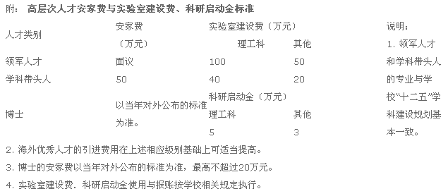 正式引进的高层次人才出具学历学位证、人事档案并与学校签订聘用合同后,以借支的方式一次性领取安家费,服务期满后冲账(也就是说,在服务器未满的情况下,就不能冲账)。实验室建设费、科研启动金以科研项目等形式划拨,首期划拨60%的经费,其余部分实行年度考核合格后划拨。引进高层次人才安家费,实验室建设费或科研启动金标准见附件。