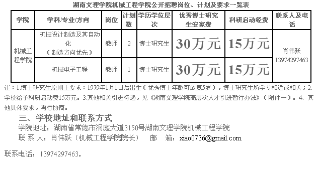 现场报名:请自行进入湖南文理学院首页(左方:机关部处)——人事处——资料下载,下载并如实填写《湖南省事业单位公开招聘人员报名表》,并提供身份证、学历学位、职称证书和有关材料原件及其复印件一式一份,直接到我校机械工程学院报名。
