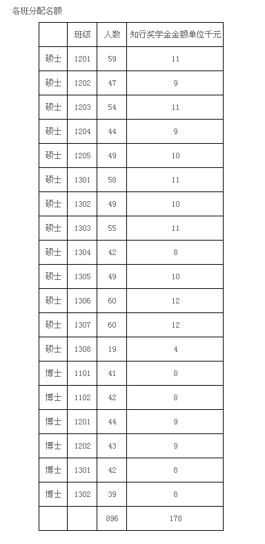 (三)获一等、二等、三等知行优秀奖的研究生分别享受3000元、2000元和1000元奖学金;学院将下拨各班级知行奖学金的总金额,由班级自行根据班级情况确定知行优秀奖学金在各层次间的等级分配,参考比例为1:2:3。