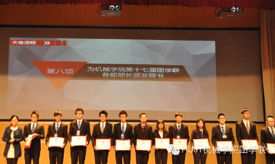 随后,播放了“致第十七届威廉希尔团学联主席团及部长”的视频,视频里同学们都深切地感受到了各位主席团成员们对这份“服务同学”的工作不舍,同时在各位主席团成员的寄语中我们也能看出他们对下一届团学联的鼓励与信任。视频结束后,由党委副书记丁雨葵老师和分团委书记胡涛老师分别为威廉希尔第十七届团学联主席团和部长颁发聘书。这是对曾经为威廉希尔辛勤工作、服务同学的主席团和部长们极大的肯定,也饱含领导以及同学们的感谢之情。