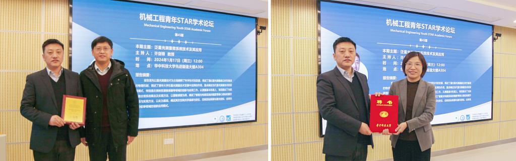 报告后,国家杰出青年基金获得者黄永安教授、国家级领军人才刘银水教授等与邢飞展开了深入的互动交流,许剑锋为其进行了报告主讲人授牌。随后举行了兼职教授受聘仪式,张芬为邢飞颁发聘书。